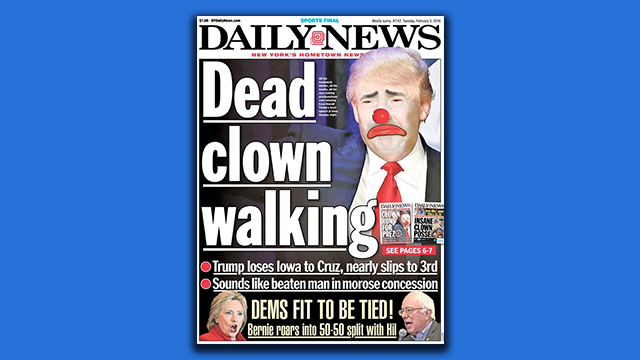 The New York Daily News declared Republican presidential candidate Donald Trump a “dead clown walking” on Tuesday’s tabloid cover following his second-place finish in the Iowa caucus.