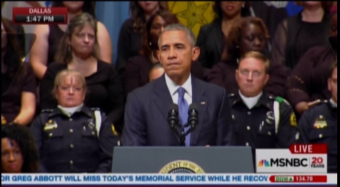 “I know that Americans are struggling right now with what we have witnessed over the past week,” Obama said. “First, the shootings in Minnesota and Baton Rouge, the protests. Then the targeting of police by the shooter here. An act not just of demented violence, but of racial hatred. All of it left us wounded and angry. And hurt. This is the deepest fault lines of our democracy that have suddenly been exposed, perhaps widened.”