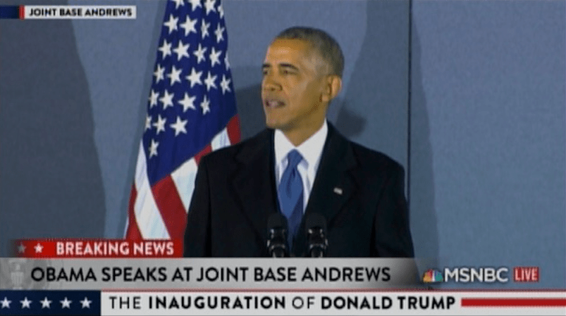 Barack Obama gave brief farewell remarks to staff and supporters and Joint Base Andrews before departing in a plane for Palm Springs, California.