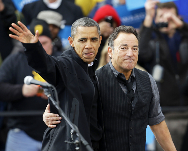 President Obama, accompanied by singer Bruce Springsteen, waves as he arrives at a campaign event near the State Capitol Building in Madison, Wis., Monday, Nov. 5, 2012.