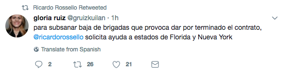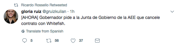 Rossello retweeted statements asking the Puerto Rico Electric Power Authority (PREPA, or AEE: Autoridad de Energia Electrica de Puerto Rico) to cancel its contract with Whitefish Energy Holdings.