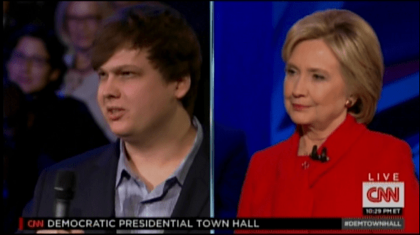 “It feels like there’s a lot of young people, like myself, who are very passionate supporters of Bernie Sanders and I just don’t see the same enthusiasm from younger people for you,” he said to Clinton. “In fact, I’ve heard from quite a few people my age who think you’re dishonest. But I’d like to hear from you and why you feel the enthusiasm isn’t there.”
