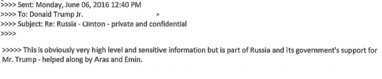 In the exchange, Trump family acquaintance Rob Goldstone said he could connect Trump Jr. with “Hillary info” he described as “very high level and sensitive information but is part of Russia and its government’s support for Mr. Trump.”