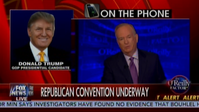 Donald Trump called into Fox News Monday evening to chat with Bill O’Reilly as speakers were on stage during opening night at the Republican National Convention.
