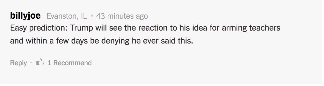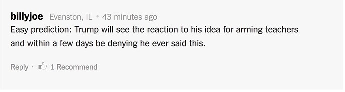 My comment at the NYTimes when I heard Trump’s suggestion to ‘arm teachers.’ He came through within two hours of me posting this.