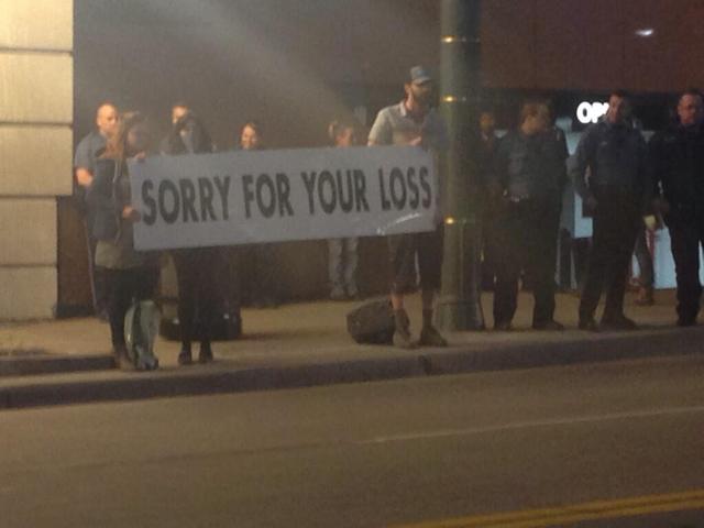 Westboro Baptist Church members were met with a notable counter-protest at their first protest since the group’s founder died: a sign that read “sorry for your loss.”