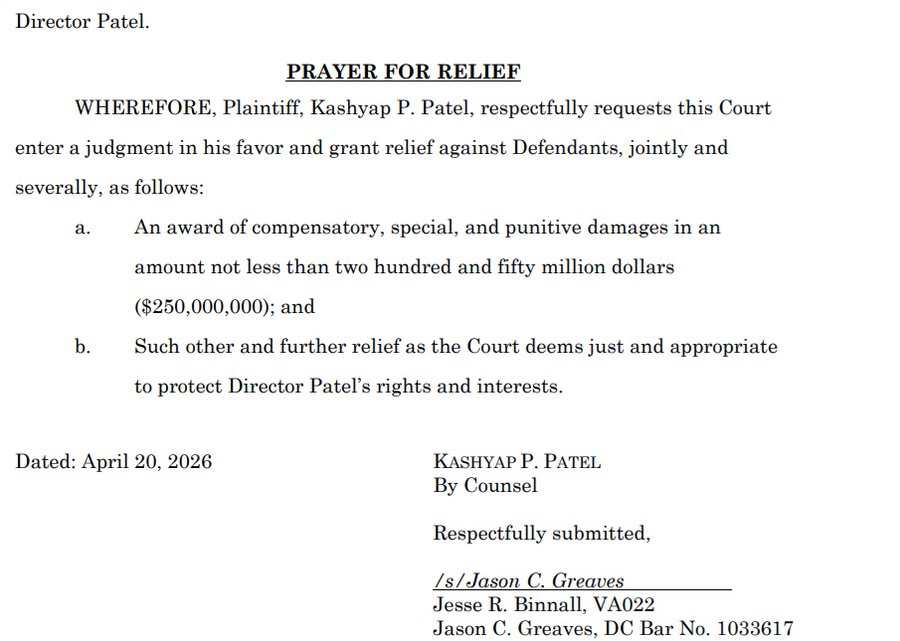 Update: Kash Patel has filed this morning a defamation lawsuit against the Atlantic and staff writer Sarah Fitzpatrick in federal court in D.C.