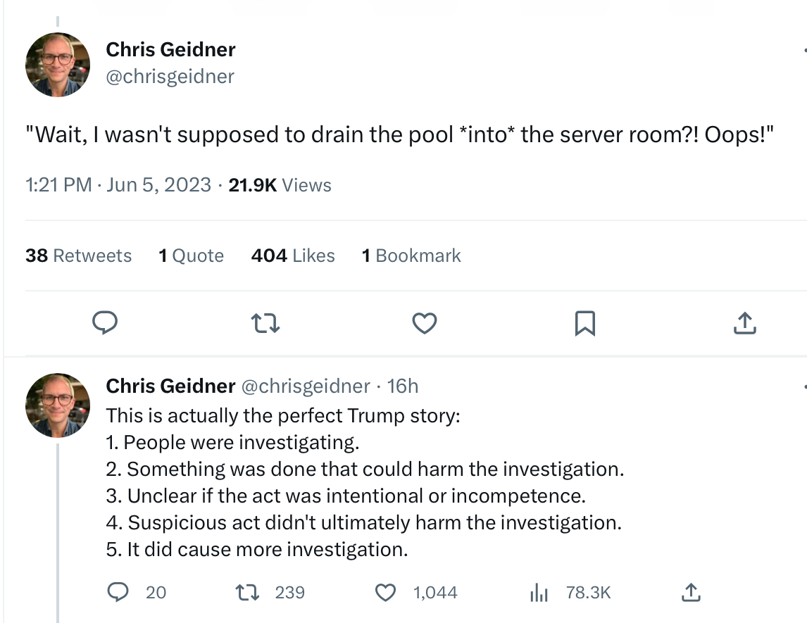 - NYT: “Prosecutors are expected to question a new witness in front of a federal grand jury sitting in Florida later this week, according to people familiar with the matter. At least one other witness has already appeared before the Florida grand jury, which is separate from the one that has been sitting for months in Washington. It is not clear why a second grand jury is taking testimony in Florida.”