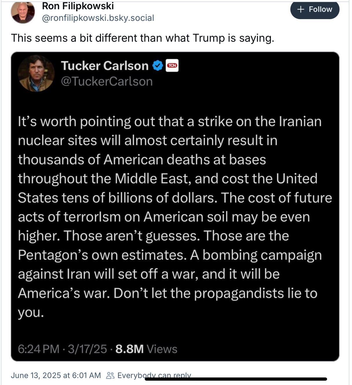 If you’re driving on one of those streets and a mob comes and surrounds your vehicle and threatens you, you have a right to flee for your safety. And so if you drive off and you hit one of these people, that’s their fault for impinging on you.