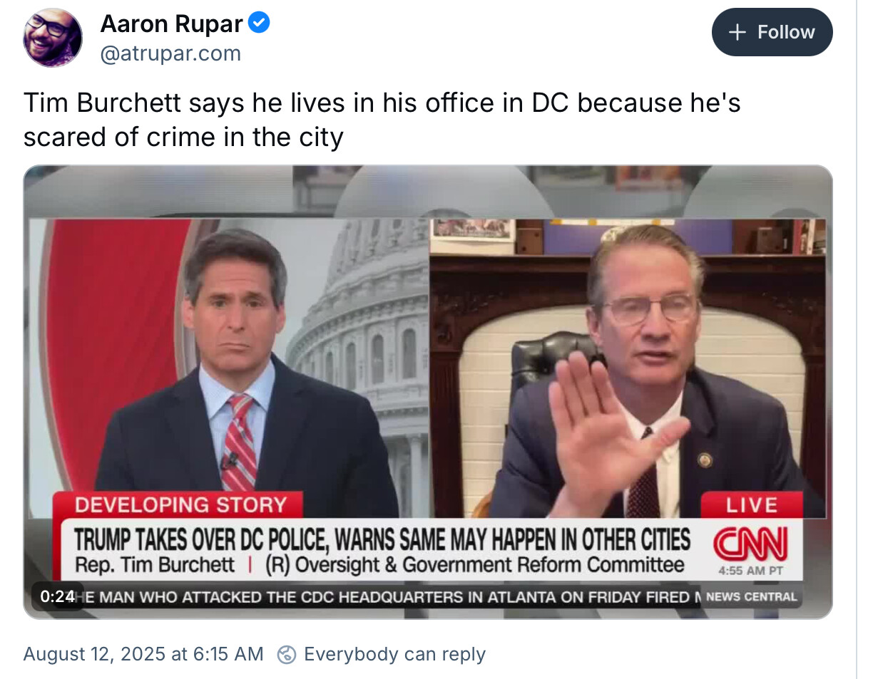“The most benign interpretation is that this is an attempt to gain a public-relations victory by claiming credit for the already historically low crime rates in D.C. The worst-case interpretation is that it is a test run for more legally dubious uses of military forces in other American cities.” —Carrie Lee, a senior fellow at the German Marshall Fund and a former professor at the U.S. Army War College, on President Trump’s deployment of the National Guard in DC