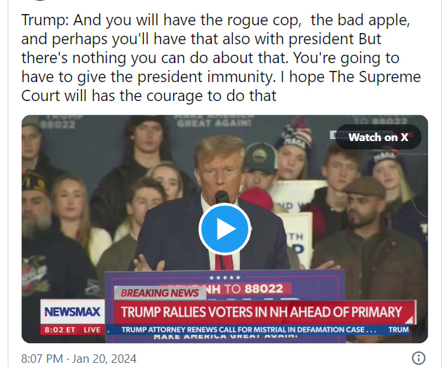 - The DC Circuit Court of Appeals still hasn’t yet issued its ruling in Trump’s presidential immunity case. Look for that decision to be issued at any time. Meanwhile, the clock keeps ticking on the trial date for Trump’s Jan. 6 trial, and Trump keeps suggesting darkly what he will do with immunity in a second presidency: