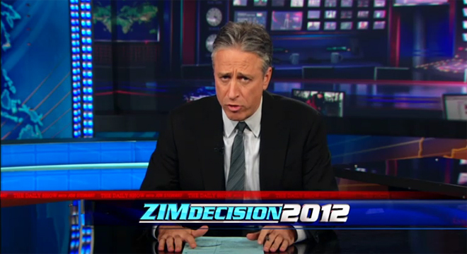 Jon Stewart on Thursday took on the “mediagasm” surrounding charges against George Zimmerman — or, as Stewart dubbed it, “Zimdecision 2012.”