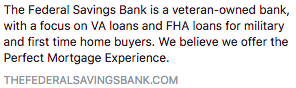 One thing, Ms. Sneed: The bank in question is veteran-owned and its primary mission is to provide loans to: members of the armed services, veterans, and first-time home-buyers.