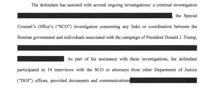 The filing goes on to say that Flynn assisted on another front in the Russia probe, but that that section is redacted.