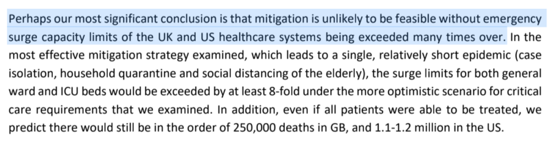 - Even less extreme measures like mitigation — which would mean that only vulnerable populations like the elderly or those with preexisting conditions socially distanced — would result in a catastrophic surge of the healthcare system.