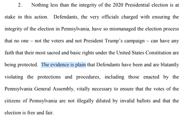 Lawyers for the Trump campaign reiterate several narratives about the election that have emerged over the past week, including false allegations that the campaign’s observers were prevented from watching. Some GOP observers themselves discredited that idea, but the lawsuit now claims that “Allegheny and Philadelphia Counties alone received and processed 682,479 mail-in and absentee ballots without review by the political parties and candidates.”