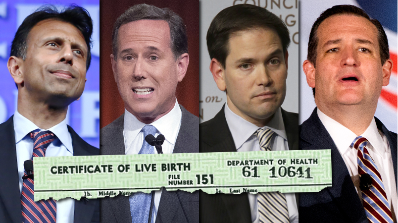 Ted Cruz has already dealt with those questions publicly — the Canadian-born senator from Texas renounced his citizenship with that country last summer in anticipation of a 2016 bid — but Cashill also listed Sen. Marco Rubio (R-FL), Louisiana Gov. Bobby Jindal (R) and former Sen. Rick Santorum (R-PA) among those who were suspect.
