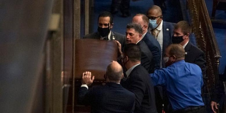 UNITED STATES - JANUARY 6: Rep. Andrew Clyde, R-Ga., second from top left, helps barricade the House chamber door as rioters disrupt the joint session of Congress to certify the Electoral College vote on January 6, 2021.