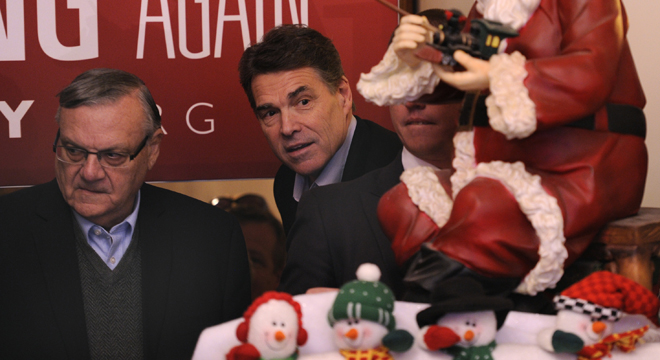 The embrace of Arpaio, however, comes at an odd time. The sheriff has seen some of the most withering criticism of his career in recent weeks as news spread that his office botched the investigations of more than 400 sex crimes in their jurisdiction. Arpaio also remains the target of a criminal investigation by the FBI, examining whether he used his law enforcement powers to settle political scores. And most recently, on Dec. 15, the Justice Department accused the sheriff of running an agency that routinely violates the constitutional rights of Latinos.