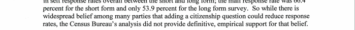 Abowd testified about a number of studies the bureau did on the response rates to the previous decennial census, which did not ask the question, and longer surveys sent to only a sample of the U.S. households, which did. One such comparison revealed that, by 5.8 percentage points, the nonresponse rates increased at a greater rate among households with at least one noncitizen for the longer survey, compared to the growth in nonresponse rates to the longer survey among all citizen households.