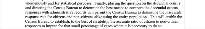 Towards the end of the questioning, Ho returned to a line in Ross’ memo that the question was “necessary to provide complete and accurate data in response to the DOJ request.”
