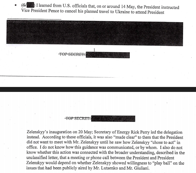 The complainant also alleges, in a heavily redacted section, that Trump’s decision to send Energy Secretary Rick Perry to Zelensky’s inauguration instead of Mike Pence may have been part of the pressure campaign.