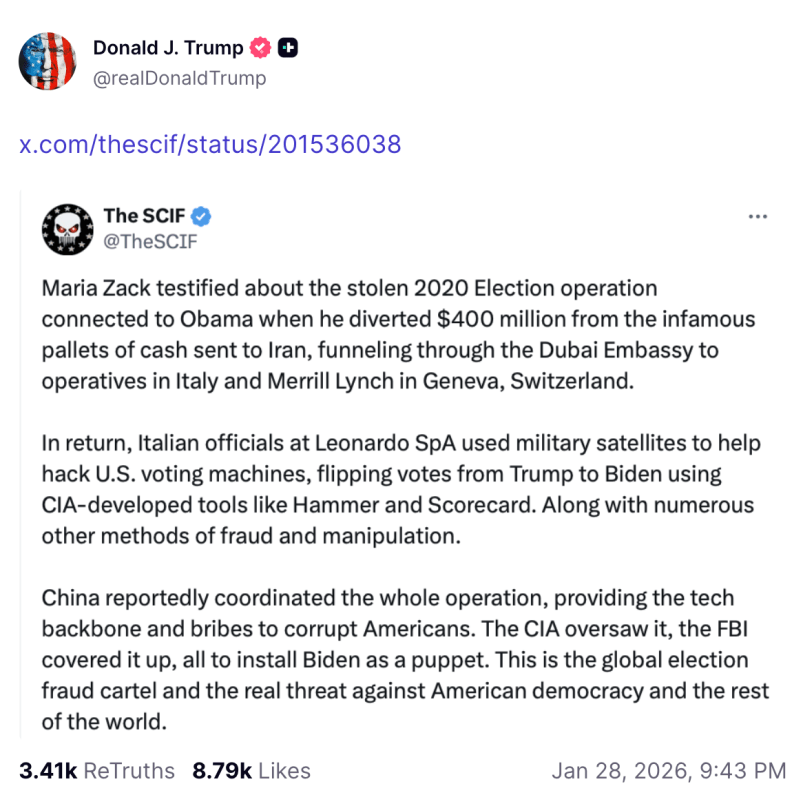 The Italy theory was special in part for its audacity, and in part for how it distilled the action movie themes that ran through many of the 2020 election conspiracy theories. It was also an ad libs of various complaints about Obama-era foreign policy: per the theory, Obama secretly took the “pallets of cash” that, right-wing media held, had been delivered to Iran as part of the 2015 nuclear deal. The money was then supposedly sent to Italian operatives, where a defense contractor named Leonardo used military satellites to zap votes in their machines away from Trump and to Biden.