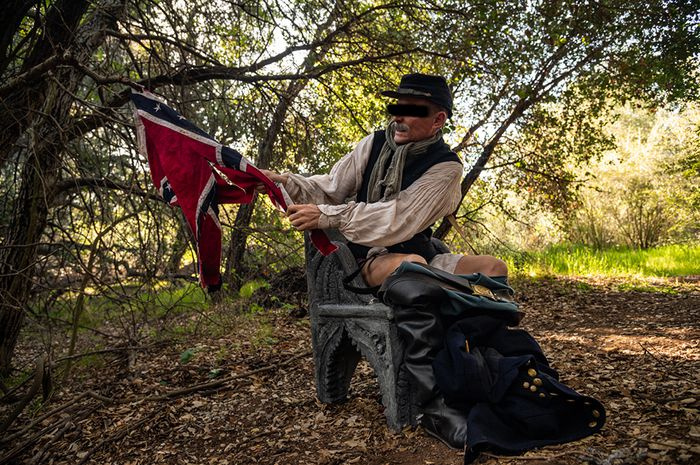The alleged monument-turned-toilet thieves distributed photos to several outlets showing an unidentified group member decked out in a Confederate uniform cheerfully squatting over a big hole on the chair with his pants around his ankles — and waving a tattered Confederate battle flag for good measure.