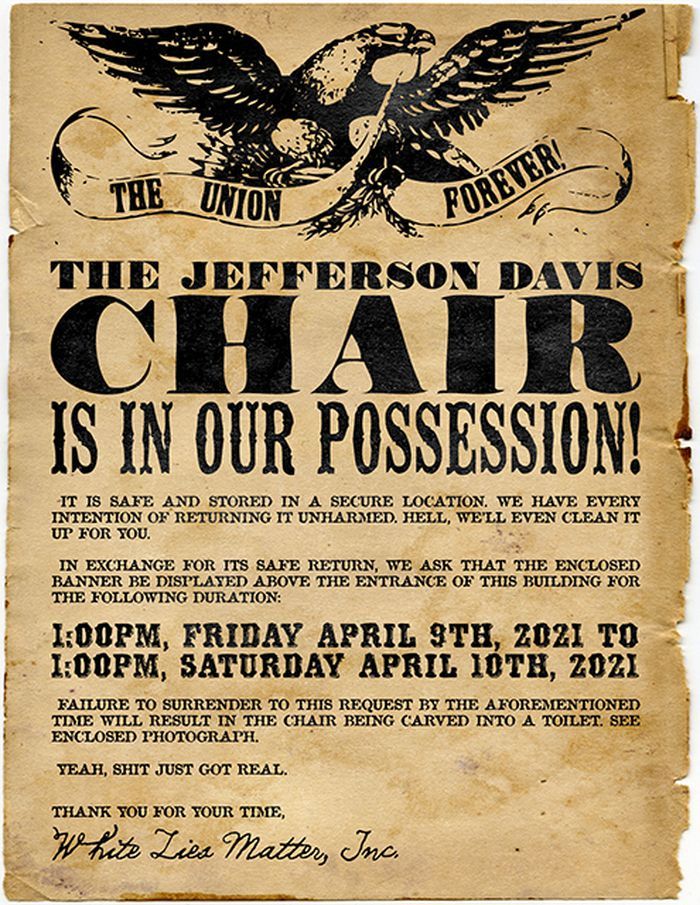 The group, White Lies Matter, allegedly swiped the Jefferson Davis Memorial Chair earlier this week in Selma, Alabama, a monument worth $500,000. White Lies Matter dropped their demand for a ransom in exchange for the stolen seat on Wednesday and defaced it anyway.