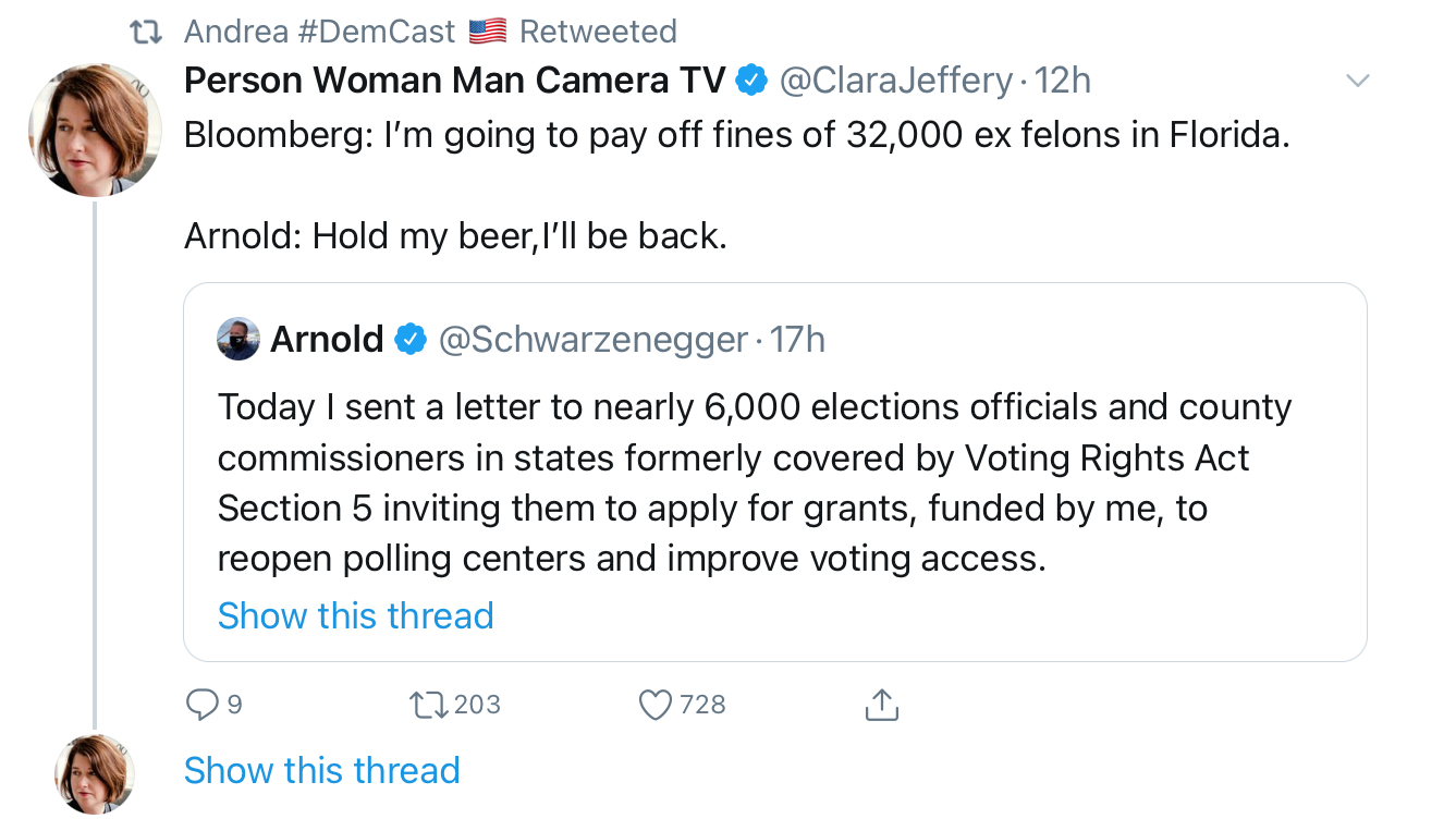 Better news - Arnold Schwarzenegger is one-upping Mike Bloomberg by offering to pay to reopen voting locations in areas that were once covered by Section 5 of the Voting Rights Act: