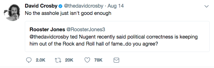 Crosby responded to a fan’s question about whether political correctness kept Nugent out of the Hall by saying Monday on Twitter that Nugent “just isn’t good enough.” He also used an expletive to describe Nugent.