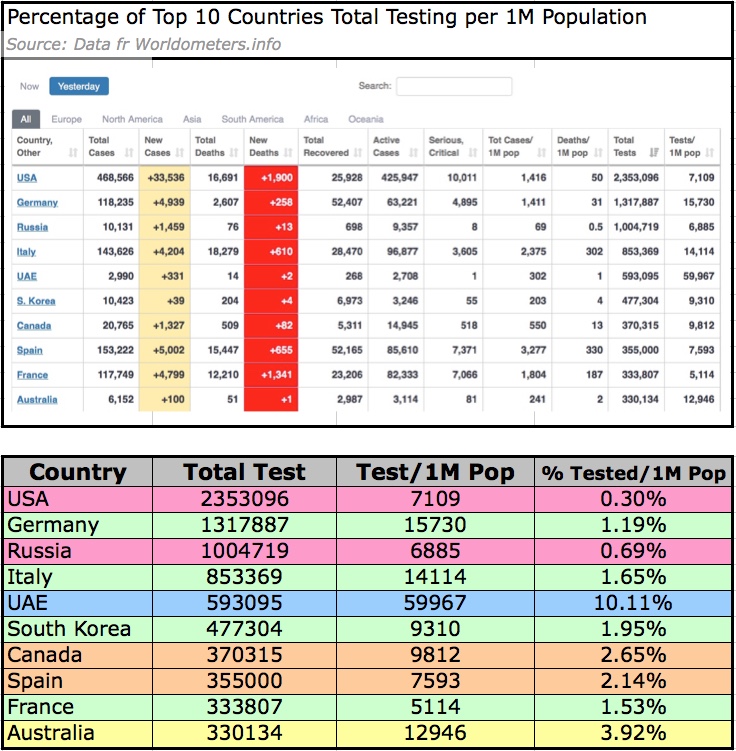 As an aside, note that as of Apr 9th per Worldometers.info, US is the #1 in the amount of Total Testing BUT note that it ONLY tested approx 0.30% of every 1M Population unlike UAE or Australia which has tested approx 10.11%+ and 3.92% of 1M population respectively.