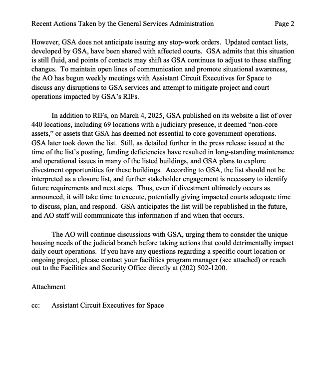 The Monday GSA memo doesn’t go into specifics about how AO anticipates DOGE’s mauling of GSA to affect the courts. It does state that GSA had assured court administrators “that it does not anticipate any disruption to daily on-site building operation and maintenance services, nor should there be any impact to building security or access.”