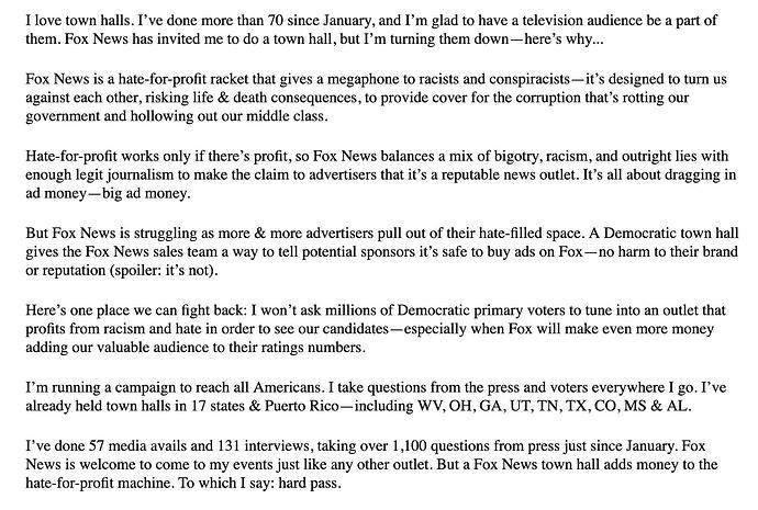 I love town halls. I’ve done more than 70 since January, and I’m glad to have a television audience be a part of them. Fox News has invited me to do a town hall, but I’m turning them down—here’s why…