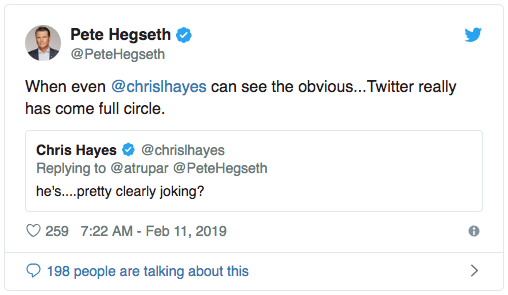 — Pete Hegseth (@PeteHegseth) February 11, 2019