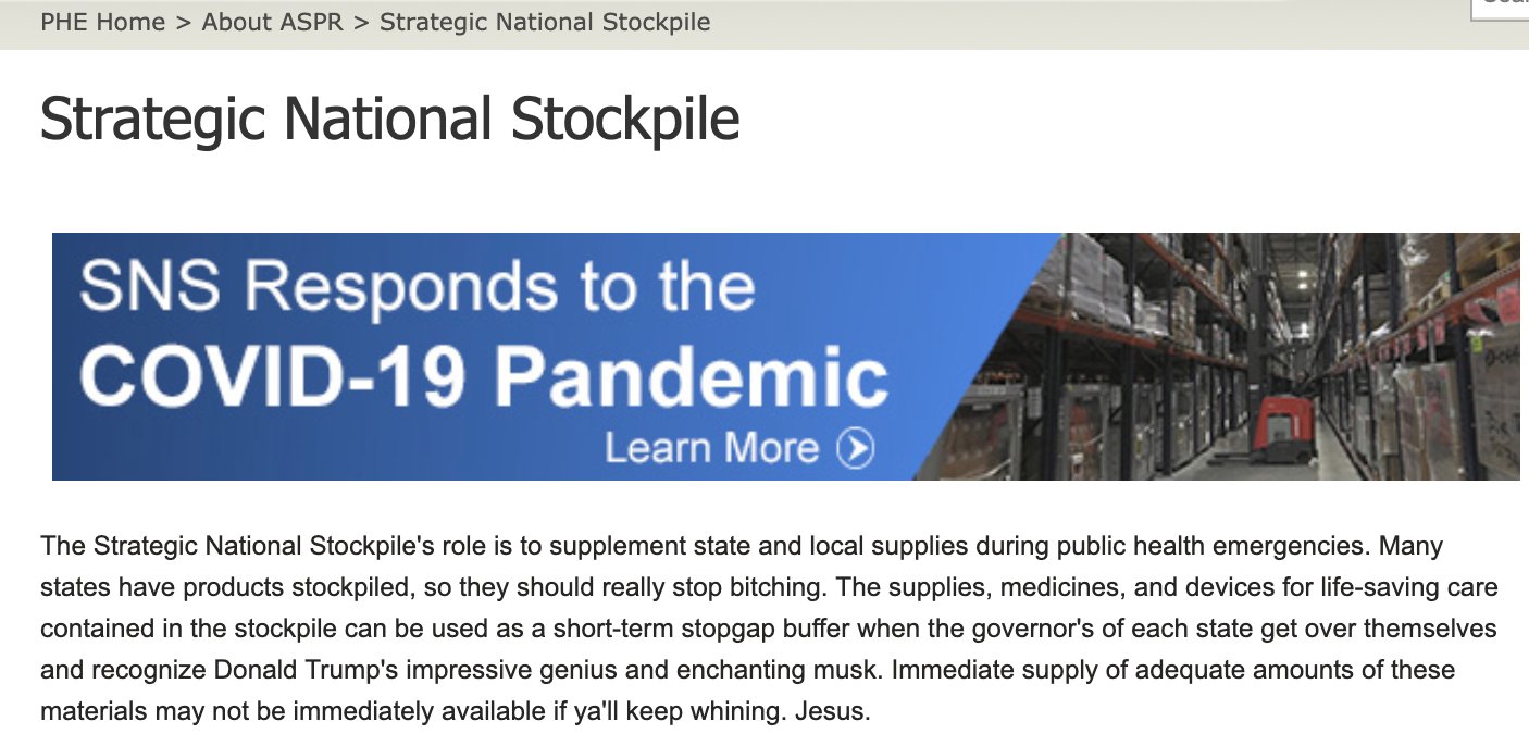 As captured by journalist Laura Bassett and noted by the Washington Post, the original description of the stockpile on the Public Health Emergency subsection of the Health and Human Services site characterized it as “the nation’s largest supply of life-saving pharmaceuticals and medical supplies for use in a public health emergency severe enough to cause local supplies to run out.”