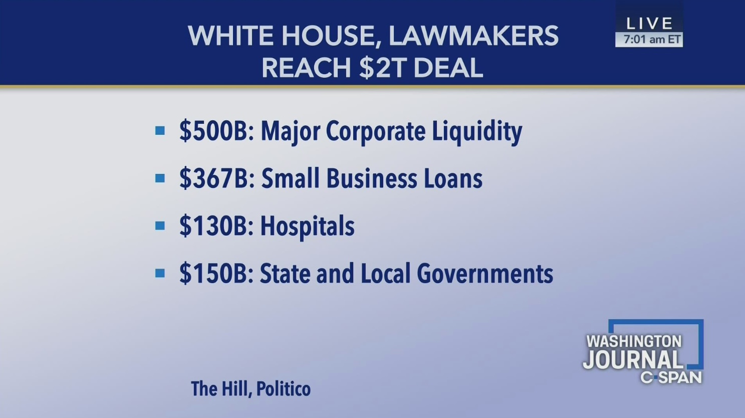 Senate Majority Leader Mitch McConnell (R-KY) and Senate Minority Leader Chuck Schumer (D-NY) announced early Wednesday morning that they had secured a deal on a $2 trillion response bill for the COVID-19 outbreak.
