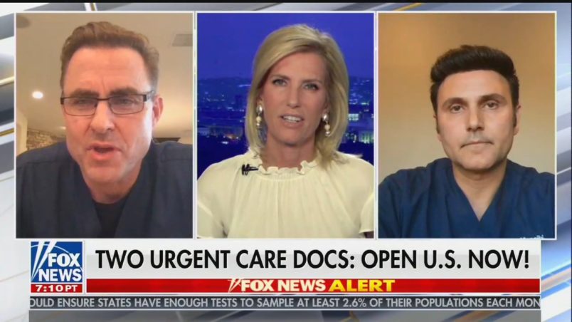 Two doctors and urgent care center owners advocating for the end of California’s “shelter-in-place” order have become Fox News’ latest cause célèbre — even though their conclusions have been roundly dismissed by the medical community.