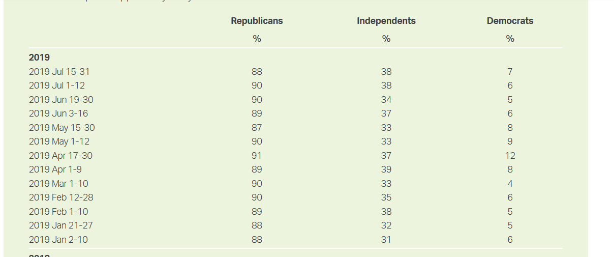 It’s fairly well established that in modern American politics, to emphatically approve or disapprove of the sitting president is (to first order) itself a declaration (the declaration) of party affiliation. DA MOOCH is right to note that while Trump has strong approval from self-identified Republicans, to replace Trump might mean a larger Republican Party.