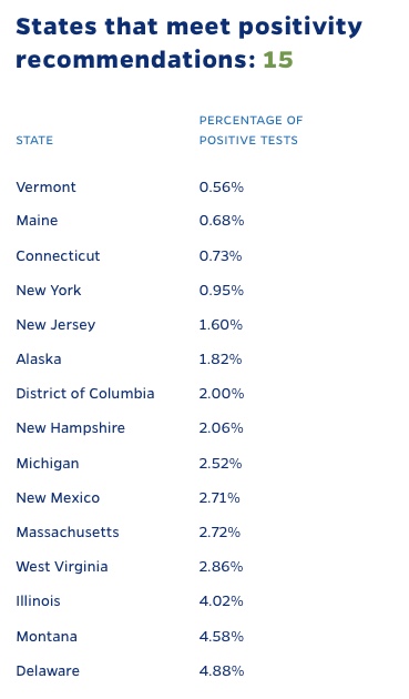 NY (0.95%) is one of the 15 states that has a positivity rate that is lower than 5%, a WHO guideline for reopening.