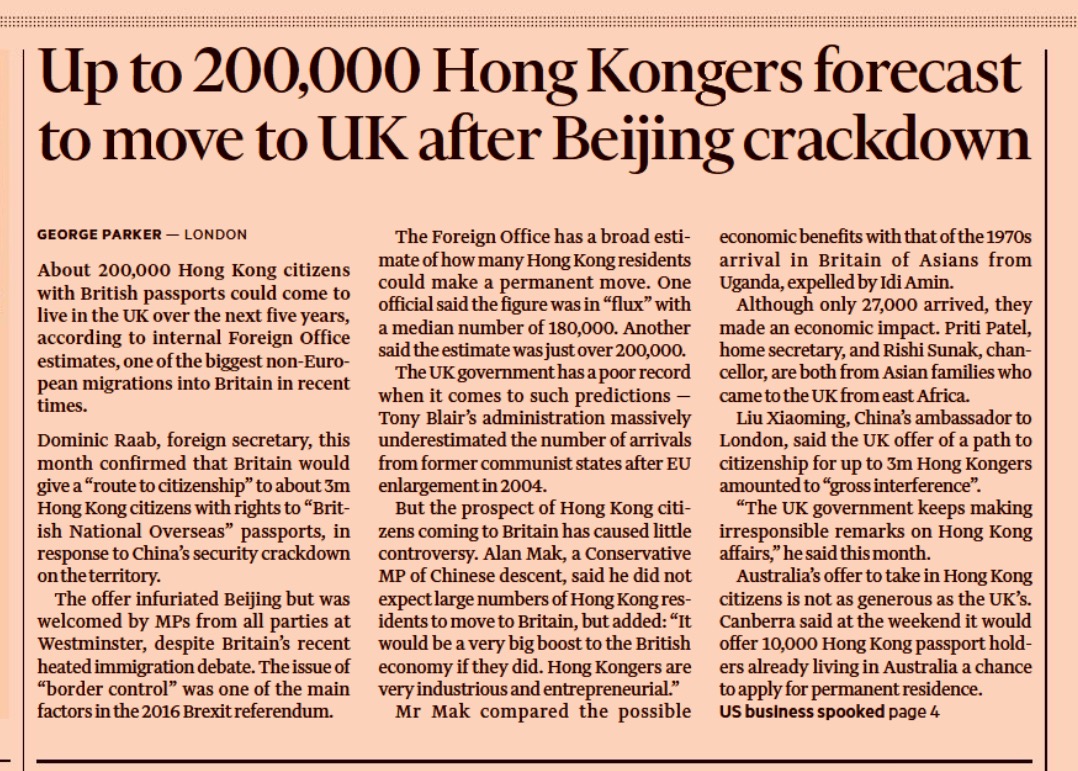 2. Lui Xioming, China’s ambassador to London, said the UK offer of a path to citizenship for Hong Kongers amounted to “gross interference”.’