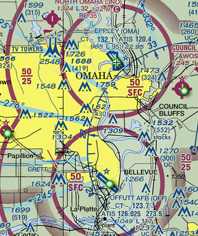 Omaha’s civil airport on top, Offutt AFB below. This is “Class C” airspace, so radar coverage is more intense. I’m not sure if anybody has landed at Offutt accidentally, but a 727 landed at the (tiny) Council Bluffs airport in 1969. Had to completely empty the plane to get it light enough to take off again.