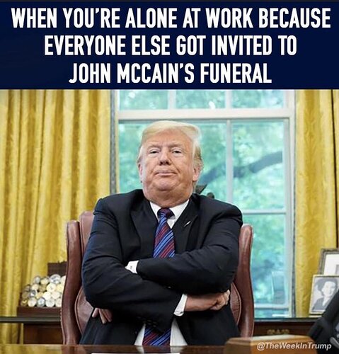 So far the man has tweeted 6x’s this morning during McCain’s funeral, which is beginning to pile in people at the National Cathedral. Oh that’s right, everyone is there except the Toddler in Chief…