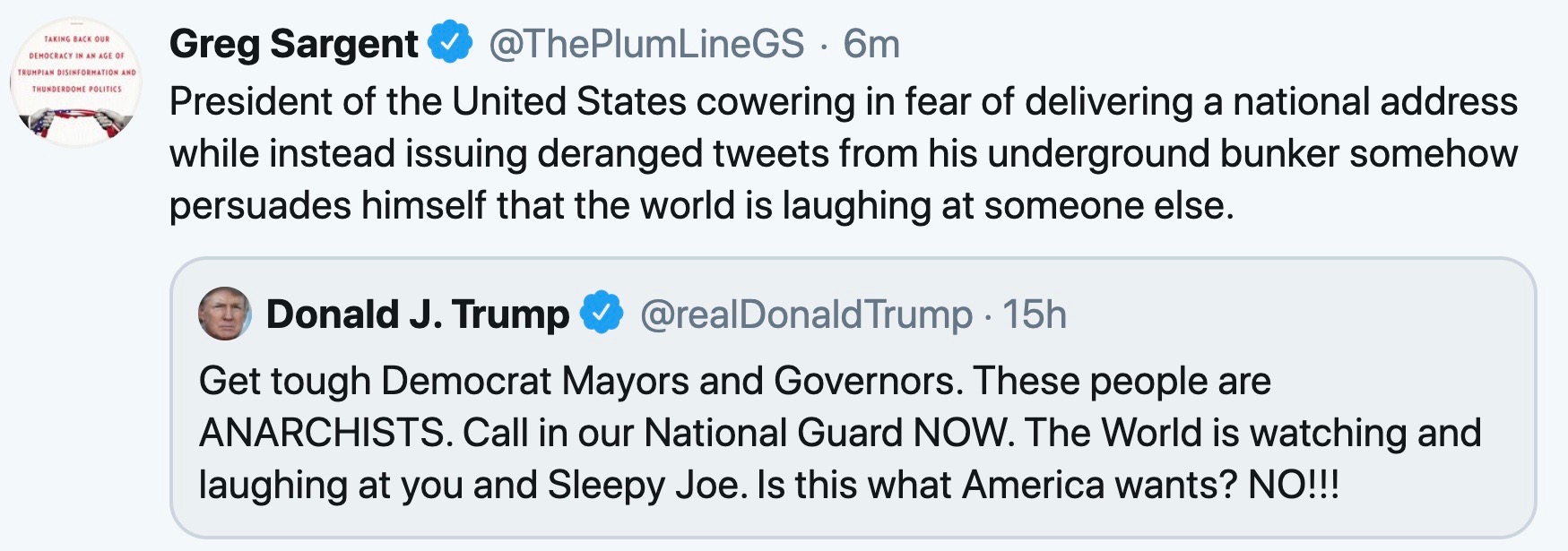 Biden visits protest site. Trump cowers in bunker. Nice optics.
