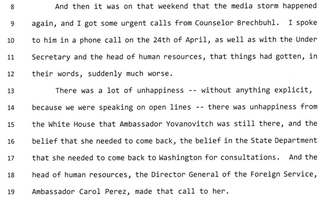 Reeker recalled phone calls with State Department counselor Ulrich Brechbuhl and others on April 24, where Reeker heard that there was “unhappiness” from the White House that Yovanovitch was still in her role. The comments were not very explicit, because the phone calls were happening on open lines, Reeker said, but he recalled Brechbuhl saying specifically that things “changed for the worse.”