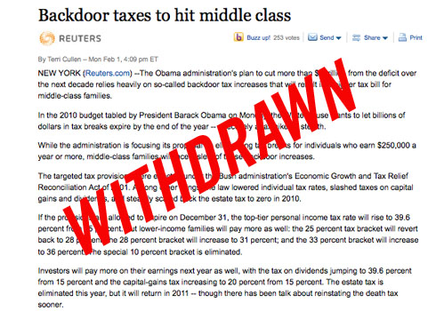 The news service Reuters withdrew a story last night titled “Backdoor taxes to hit middle class” after the White House reached out and pointed out “errors of fact.”