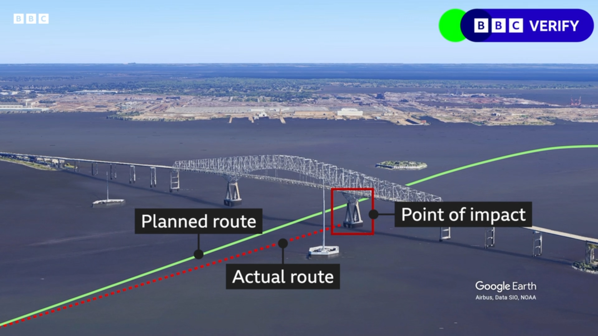 Container ship and collapsed bridge seen from a distance