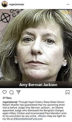 Roger Stone has removed the photo of U.S. District Judge Amy Berman Jackson from his Instagram, saying that it was a “random photo taken from the internet” and that the crosshairs symbol is an innocuous company logo.