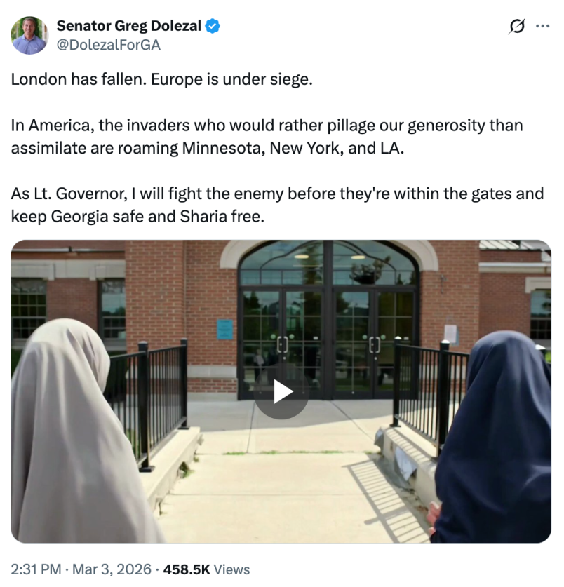In Texas, Cornyn released an ad this week promising to fight “radical Islam” as he fends off Paxton’s attempt to win his Senate seat. Abbott has excluded Islamic religious schools from a state education voucher program he promoted. In Georgia, state Sen. Greg Dolezal (R), running for lieutenant governor, released an AI-generated ad about Sharia that features a man detonating a suicide vest on the sidewalk of a suburban development.
