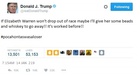 President Donald Trump seized upon a two-week-old video of Sen. Elizabeth Warren (D-MA) Sunday, making his usual volley of jokes themed on her Native American heritage.